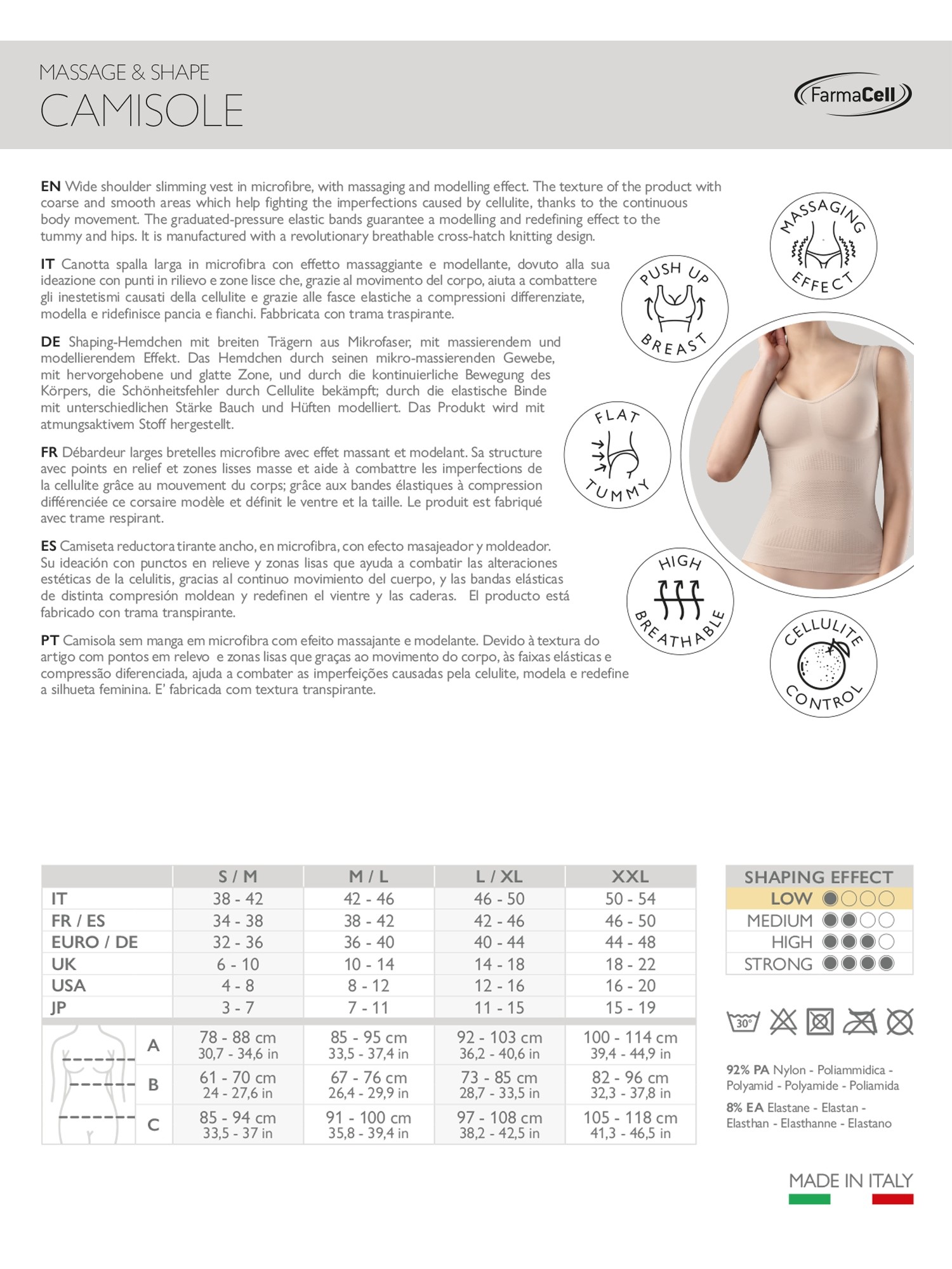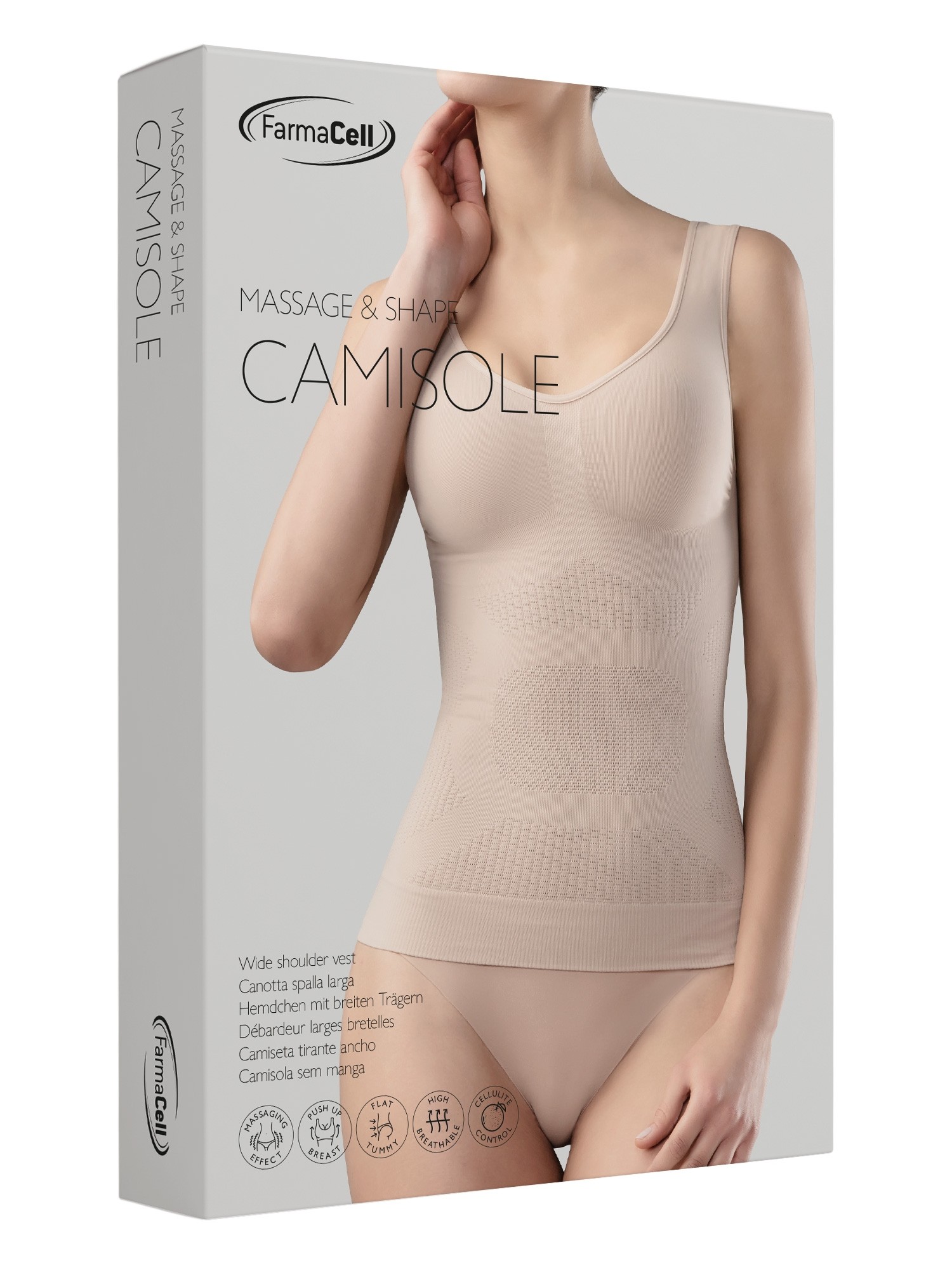 Vysoká elasticita materiálu s vynikajúcou schopnosťou kompresie zaručuje pohodlné obliekanie tielka. Spodný lem je navrhnutý a ušitý tak, aby sa predišlo vyhŕňaniu bielizne a ona tak mohla počas celého dňa plniť svoju funkciu. Priedušná látka dovoľuje pokožke dýchať, dôsledkom čoho sa telo pod tielkom nepotí. Tielko Farmacell zoštíhľuje postavu bez toho, aby spôsobovalo nepríjemné pocity stiahnutia v oblasti žalúdka alebo pľúc. Pri nosení poskytuje úplnú voľnosť. Tkanina v oblasti poprsia zabezpečuje push-up efekt, no zároveň prsia nestláča a opticky neredukuje ich objem. Jemne ich pozdvihne a dodá im pevnú oporu aj pri pohybe alebo športe.