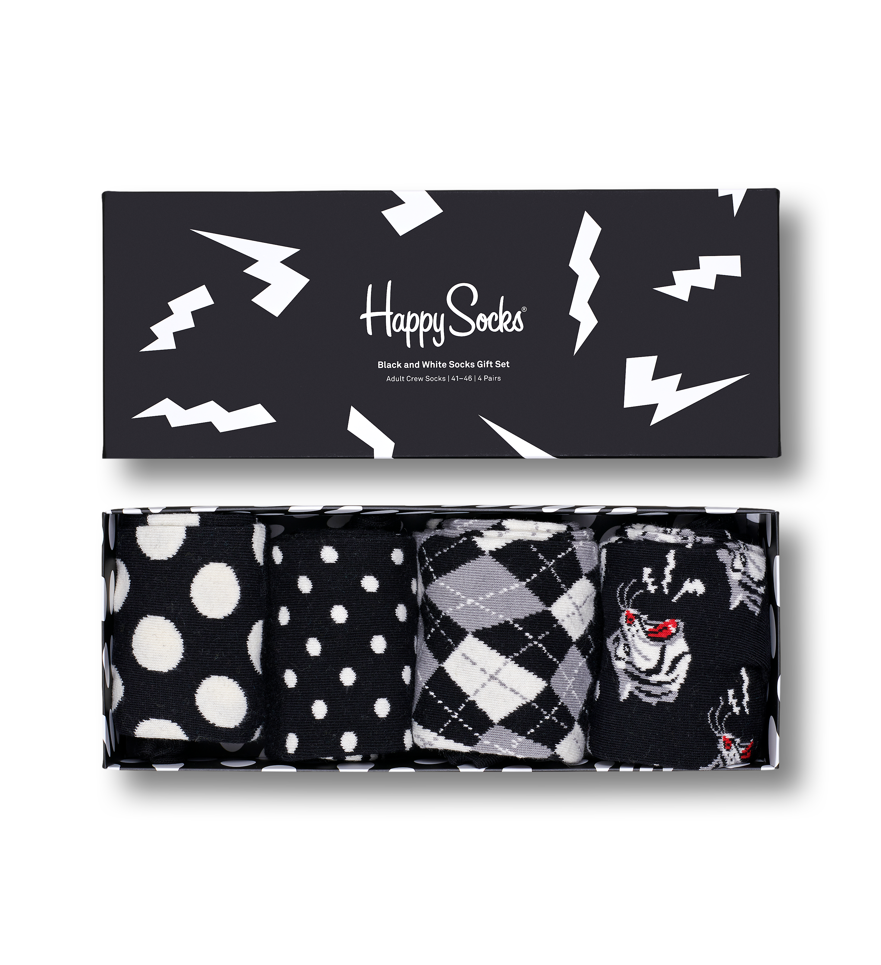 Darčekový box obsahuje 4 páry čierno-bielych vzorovaných ponožiek pre zástancov klasiky.