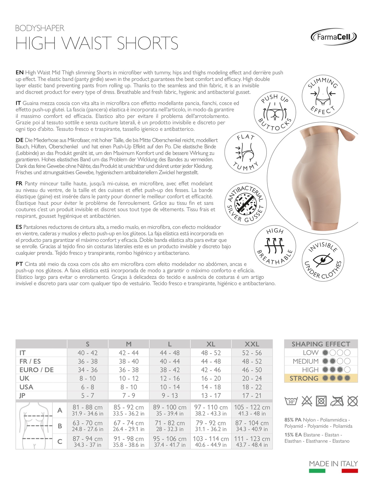 Silné, elastické vlákno je schopné prispôsobiť sa aj nesúmernej postave a zároveň ju vytvarovať tak, aby pôsobila opticky štíhlejšia a symetrickejšia. Dámske kraťasy Farmacell sú z jemného a priedušného materiálu, ľahko sa navliekajú a po oblečení vytvárajú pocit druhej kože. Vďaka svojej priedušnosti sú vhodné aj na celodenné nosenie, pričom poskytujú maximálny pocit pohodlia. K úplnému komfortu prispieva aj jemný klin, ktorý sa nezarezáva do pokožky a vďaka striebornému vláknu predstavuje dokonalé antibakteriálne prostredie.