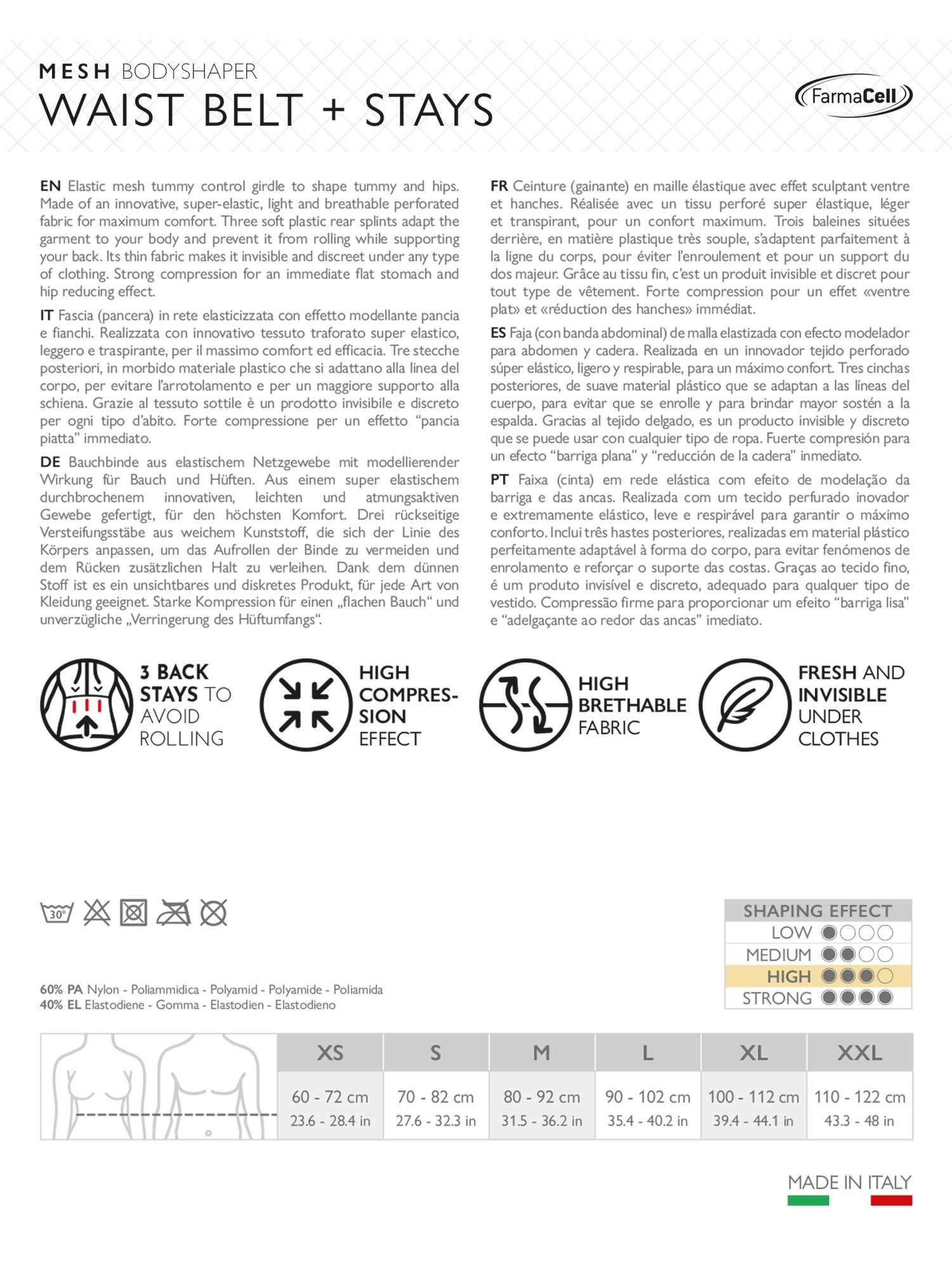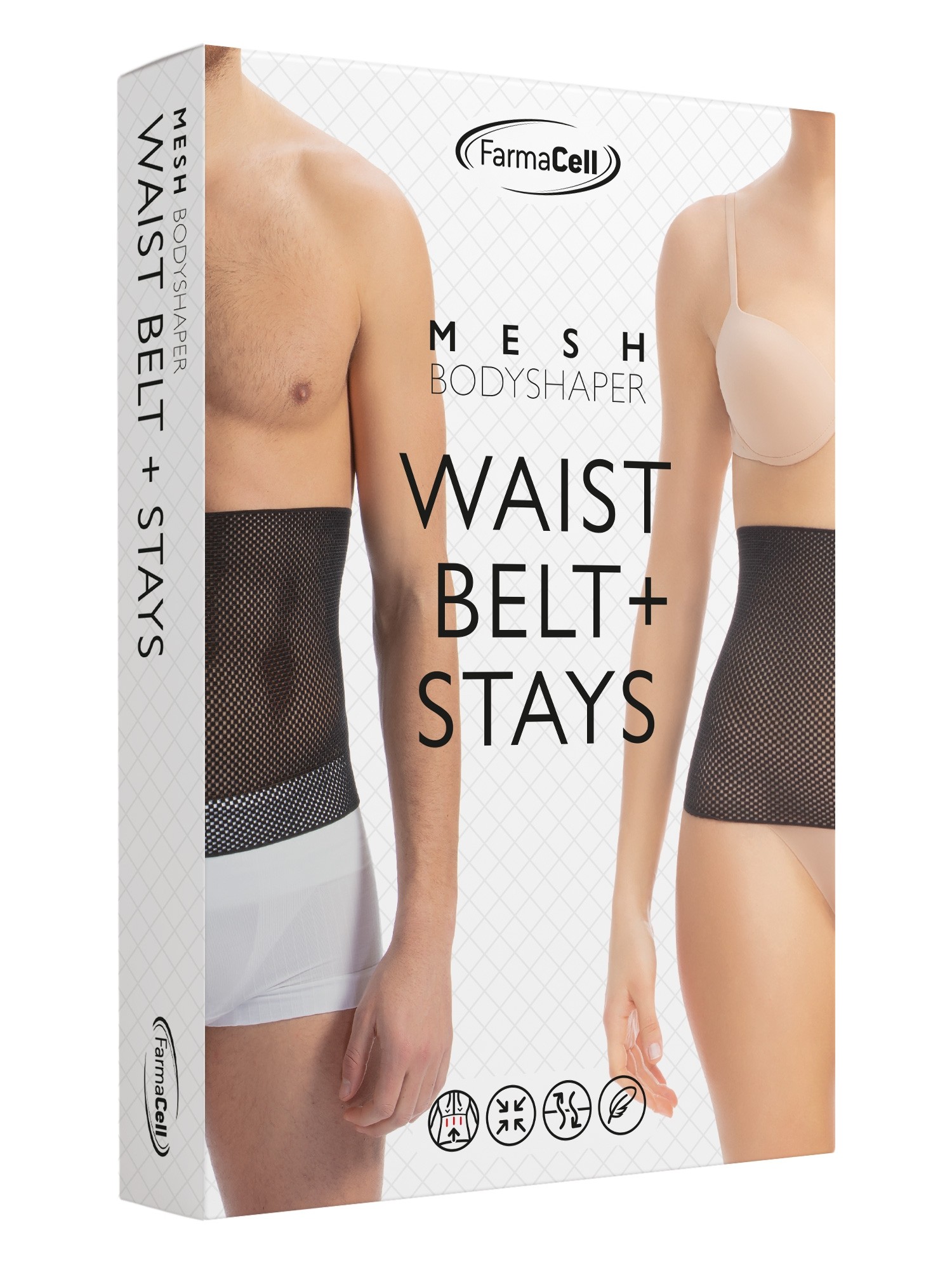 Ľahký a priedušný korzet, ktorý tvaruje brucho a bedrá. Vyrobený je z inovatívnej, super elastickej, ľahkej a priedušnej perforovanej látky pre maximálne pohodlie počas letných horúčav. Pás má vzadu všité 3 plastové dlahy, ktoré zabráňujú rolovaniu a zároveň poskytujú oporu chrbta. Sťahovací pás Farmacell má výborný tvarovací a kontrolný účinok na boky a žalúdok. Vďaka svojej silnej kompresii vyrovná vaše brucho (zabráni prevísaniu kože), tvaruje pás a vyhladí siluetu tela. Jeho bezproblémová konštrukcia a anatomický tvar vám poskytnú maximálny komfort. Pás Farmacell je tiež priedušný a ľahký, rovnako je neviditeľný pod oblečením kvôli jeho tenkej tkanine.